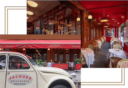 In addition to our main dining space and bar seating, Jacques Brasserie brings you a variety of al fresco dining locations. Our sidewalk seating is a wonderful setting for a summer meal, offering protection from the overwhelming hustle and bustle of the streets while still allowing you to soak up the atmosphere of the city.